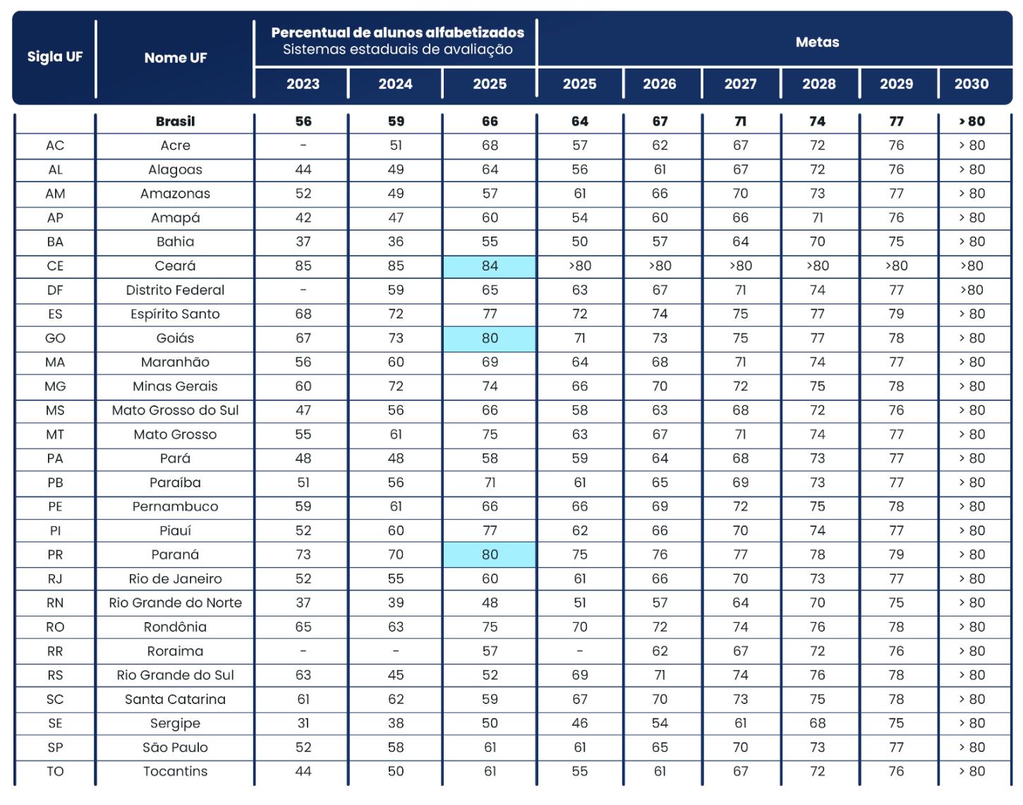 No panorama geral, o Amazonas também não conseguiu cumprir a meta estabelecida pelo Ministério da Educação. O estado registrou índice de 57%, abaixo dos 61% previstos para 2025.