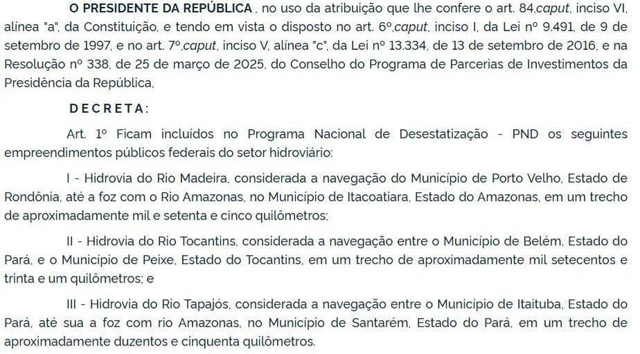 O decreto nº 12.600, assinado por Lula em 28 de agosto e publicado no Diário Oficial da União no dia 29, autoriza a inclusão de trechos hidroviários estratégicos no PND. Estão previstos: